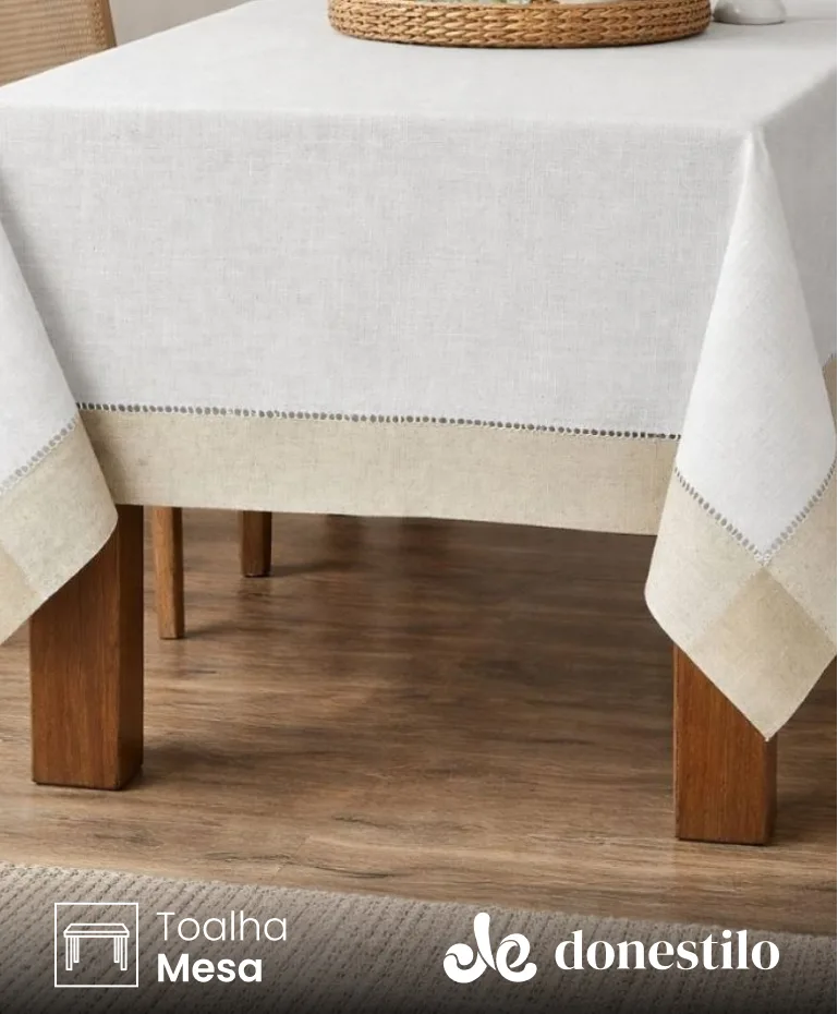 Toalha de mesa quadrada 2,00m x 2,00m, ideal para mesas de até 8 lugares. Em 100% algodão, com barra em