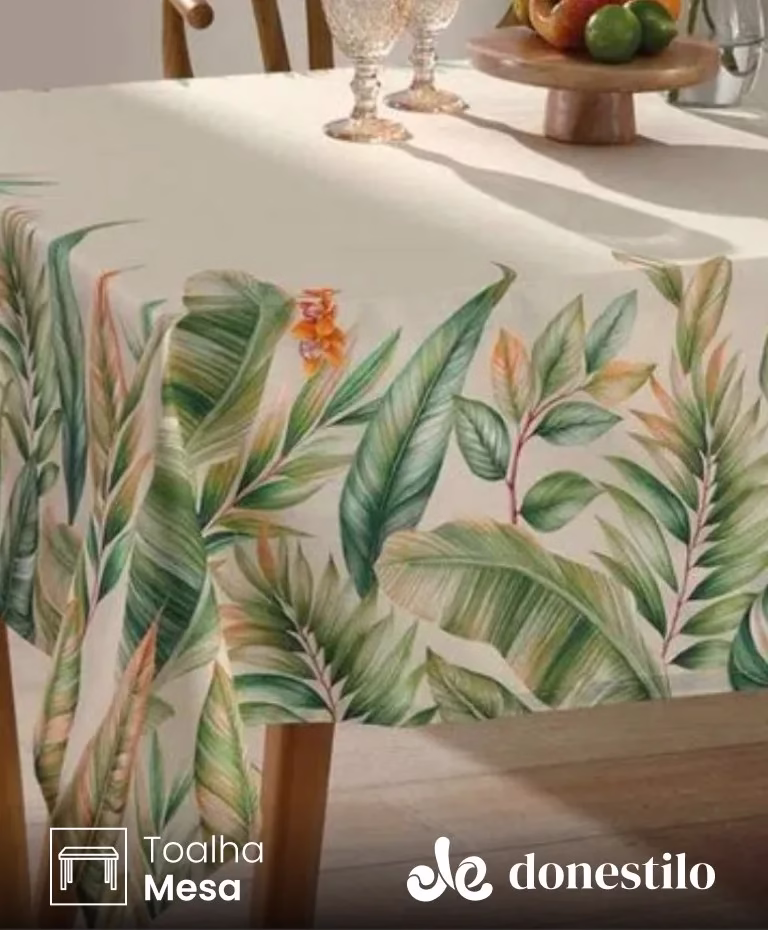 Toalha de Mesa Quadrada Döhler para 4 lugares, modelo Renova Hércules (1,40 x 1,40 m), traz uma linda e moderna estampa inspirada nas folhagens e na natureza, oferecendo leveza e sofisticação à sua cozinha. Com tecnologia de estamparia digital, sua fabricação é mais sustentável, e os desenhos apresentam uma riqueza de detalhes e alta qualidade. Além disso, o produto possui o selo Döhler Clean, que adiciona uma camada protetora, facilitando a limpeza e aumentando a durabilidade da toalha. Confeccionada com 50% algodão e 50% poliéster, esta toalha tem gramatura de 170 g/m², combinando resistência e suavidade ao toque.