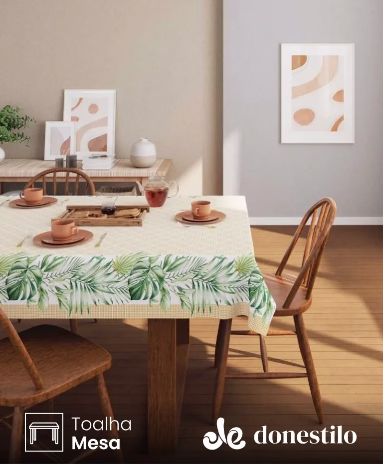 A Toalha de Mesa Quadrada Lepper, modelo Palmas, 4 lugares, mede 1,40×1,40 m, composta por 80% algodão e 20 % poliéster, garantindo ótima durabilidade.