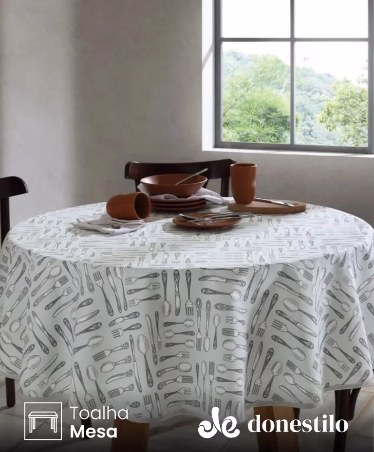 Toalha de Mesa Redonda Döhler para 4 lugares, modelo Athenas Ellie (1,60 m), traz seu design moderno, com uma padronagem formada por talheres. Prática e versátil, é ideal para o dia a dia. Além disso, o produto possui o selo Döhler Clean, que adiciona uma camada protetora, facilitando a limpeza e aumentando a durabilidade da toalha. Confeccionada com 50% algodão e 50% poliéster, esta toalha tem gramatura de 170 g/m², combinando resistência e suavidade ao toque.