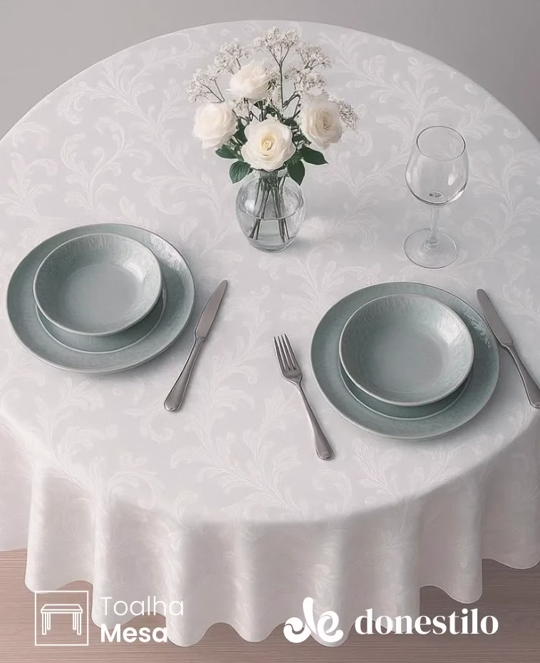 A Toalha de Mesa Redonda Döhler 4 lugares Requinte TJ4668, de 1,60 m, é elegante e funcional. Feita de 100% poliéster e tecido Jacquard, oferece durabilidade e acabamento refinado. Com densidade de 200 g/m², proporciona base estável e confortável para refeições, realçando charme e sofisticação.