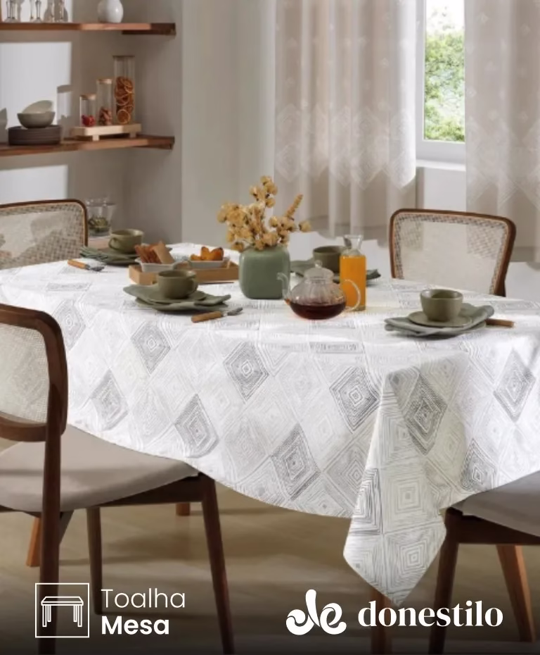 Toalha de Mesa Retangular Döhler para 6 lugares, modelo Athenas Martin (1,40 x 2,10 m), traz seu design moderno, oferecendo leveza e sofisticação à sua cozinha. Com tecnologia de estamparia digital, sua fabricação é mais sustentável, e os desenhos apresentam uma riqueza de detalhes e alta qualidade. Além disso, o produto possui o selo Döhler Clean, que adiciona uma camada protetora, facilitando a limpeza e aumentando a durabilidade da toalha. Confeccionada com 50% algodão e 50% poliéster, esta toalha tem gramatura de 170 g/m², combinando resistência e suavidade ao toque.