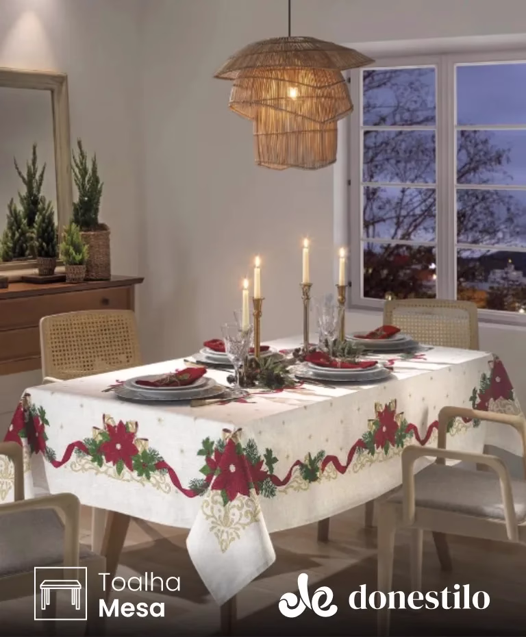 A Toalha de Mesa Retangular Dohler para 8 lugares, modelo Athenas Natal 105. Com detalhes em lurex, essa peça traz ainda mais beleza e sofisticação para a sua celebração, destacando-se pelo seu acabamento fino. Confeccionada com uma mistura de 50% poliéster e 50% algodão, com gramatura de 170 g/m², garante durabilidade e um toque agradável. Seu tamanho é 160×250 cm