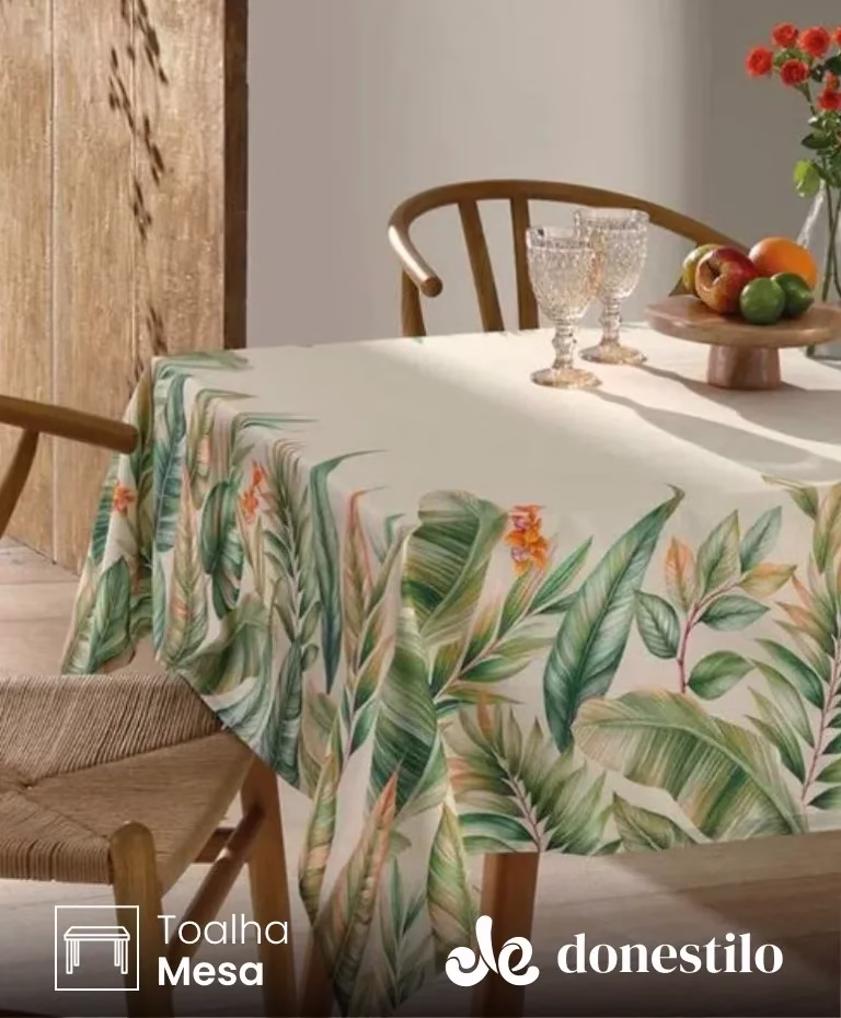 Toalha de Mesa Retangular Döhler para 8 lugares, modelo Renova Hércules (1,60 x 2,70 m), traz uma linda e moderna estampa inspirada nas folhagens e na natureza, oferecendo leveza e sofisticação à sua cozinha. Com tecnologia de estamparia digital, sua fabricação é mais sustentável, e os desenhos apresentam uma riqueza de detalhes e alta qualidade. Além disso, o produto possui o selo Döhler Clean, que adiciona uma camada protetora, facilitando a limpeza e aumentando a durabilidade da toalha. Confeccionada com 50% algodão e 50% poliéster, esta toalha tem gramatura de 170 g/m², combinando resistência e suavidade ao toque.
